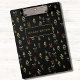 Um fundo preto, padrão de flor silvestre vintage e uma prancheta de nome ouro moderna são na moda.