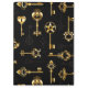 Padrão perfeito de chaves antigas, douradas e silhuetas em fundo preto.