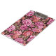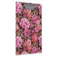 A vibrant array of pink and orange peonies is artfully arranged against a dark background, creating an eye-catching and colorful floral pattern. The detailed blossoms are interspersed with rich green leaves, enhancing the lush appearance.