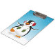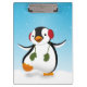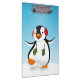 Uma bela ilustração do inverno: um pinguim com luvas e tocas de humor está caminhando na neve.