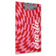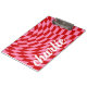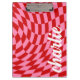 Área de transferência com um padrão de tabuleiro de xadrez cor-de-rosa e vermelha e retorcida e o seu nome em uma fonte branca e com estilo retroativo.
