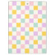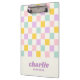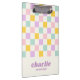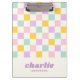 Área de transferência com uma rosa claro, um padrão de tabuleiro azul-amarelo, roxo e aqua e seu nome em estilo retroativo, fonte roxa com uma linha de texto personalizado abaixo. Todas as cores são personalizáveis.