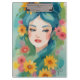 Este design vibrante e caprichoso apresenta um retrato abstrato de uma mulher com cabelo azul lacrimejado com flores coloridas. Sua expressão serena é acentuada por olhos fechados e lábios vermelhos, dando a ela uma aparência de sonho. Ao redor dela estão girassóis vibrantes, flores cor-de-rosa, e uma variedade de folhagem verde, criando uma atmosfera exuberante, semelhante a jardim. A peça tem um estilo de interface suave e vetorial, dando-lhe um sentimento moderno, mas romântico. A paleta de cores é dominada por chaleiras, amarelos, pinças e verdes, criando uma composição harmoniosa e atraente para os olhos. Personalizar com iniciais.