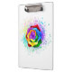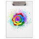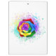 Rosa grande e florescente com pétalas arco-íris sobre fundo branco, pintadas com pedaços de tinta colorida e brilhante. 3d