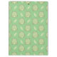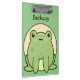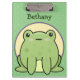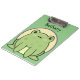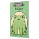 Adorável sapo verde kawaii com uma leve pincelada em suas bochechas em um círculo amarelo sobre um fundo verde que tem um pequeno padrão de bolinhas branca nele. Acima está uma modelo para adicionar seu nome ou outra mensagem pessoal. As costas têm um padrão de muitas do mesmo sapo com folhas verdes.