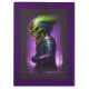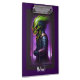 A cartoon demon head with green hair, sharp teeth, and red eyes on a purple and black background creates an awesome clipboard for any heavy metal fan.