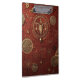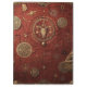 An ornate emblem glows in gold against a textured crimson backdrop, surrounded by arcane symbols and cryptic inscriptions.