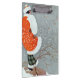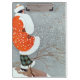 Art Deco vintage illustration of a woman wearing a red fur lined winter coat and hat, standing in the blowing snow with a cluster of snow buntings flying in front of her. Magazine cover illustration by Will Hammell (1914).