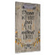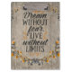 Estilo de tipografia motivacional citação "Sonho sem medo, Viva sem limites", elementos florais sobre fundo de madeira