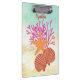 Duas conchas castanhas e castanhas, uma estrela do mar laranja, e coral rosa claro estão dispostos em uma base arenosa com água verde-marinha acima delas. Esta é a prancheta perfeita para qualquer um que ama a natureza, o oceano e a vida marinha.