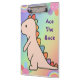 Uma prancheta com o fundo do arco-íris e Dinossauro na frente. Ela vem com uma citação motivacional, mas se você sente a necessidade de personalizá-la ou mudá-la para algo que você gosta, você pode fazer isso. Vá em frente e compre para seu filho; tenho certeza que eles vão adorar.