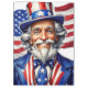 Tio sorridente Sam USA American Icon vestindo um terno americano e uma bandeira americana balançando ao fundo