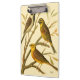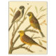 O artista W. Rutledge capturou perfeitamente as cores vivas dessas aves domésticas. Obtenha esta pintura simples, mas lindamente realista. Vista lateral de dois pássaros amarelos e um pássaro mais escuro em um galho e olhando em direções diferentes.