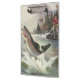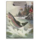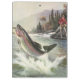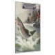 Ilustração esportiva vintage com um pescador pescando em um rio. Uma truta arco-íris está se debatendo e saltando para fora da água.