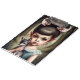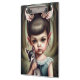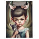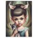 Perdido num mundo de imaginação e amor. Uma jovem está segurando um veado em seus braços. A garota está vestindo um vestido azul e tem um par de chifres na cabeça. A cena está em uma floresta, com árvores ao redor da menina e do veado