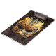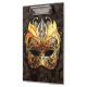 A decorative masquerade mask features intricate designs in gold and black, embellished with ornate damask patterns and vibrant yellow feathers. The mask exudes an elegant and luxurious vibe, suitable for a grand celebration or ball. Venetian Mask