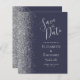 A borda esquerda deste elegante casamento moderno salve o cartão de data apresenta uma borda cintilante. O texto personalizável combina a escrita manual de cinzas prateadas, fontes copperplate e itálico em um fundo azul escuro. O verso apresenta um design azul e prateado correspondentes.