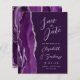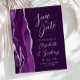 A borda esquerda deste elegante casamento moderno salve o cartão de data apresenta uma coloração d'água roxa com borda fina de prata. O texto personalizável combina a escrita manual de cinzas prateadas, fontes copperplate e itálico em um fundo de ameixa. O verso apresenta um design de agata prateado e roxo correspondente.