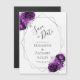 Este elegante casamento moderno, exceto a data, que traz um quadro geométrico prateado, decorado com buquês florais roxos e prateados em fundo branco. O texto personalizável combina a escrita manual imétrica de cinzas prateadas, a placa de cobre e as fontes itálicas.
