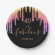 Uma placa de aniversário de 40 anos de moda e glamourosa. Um fundo preto clássico, decorado com pingos de brilho falso e colorido do arco-íris, pingando tinta, parece roxo, rosa e ouro rosa. Com o texto: 40 e fabuloso. Personalize e adicione um nome. Texto colorido do ouro. A palavra Fabuloso é escrita com um moderno estilo escrito à mão com traços. Os guardanapos de papel estão disponíveis na nossa loja.