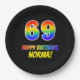 Este alegre, divertido e colorido design de papel de aniversário apresenta um grande número "69" e a mensagem "FELIZ ANIVERSÁRIO", ambos tendo um gradiente de padrão inspirado no espectro do arco-íris, junto com um nome ousado e amarelo editável. O fundo é preto colorido. Pratos de papel com tema de aniversário como este podem ser divertidos de ser usados em uma celebração sendo realizada para homenagear alguém que comemora seu sexagésimo nono aniversário. [~Z0000488]