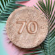 Esta design cinzenta, cinzenta, apresenta um padrão de manchas-leopardo rosa-douradas cintilantes em um fundo cor-de-rosa pincelado, com "70" em grandes números de balões de ouro rosa. Ideal para uma festa de aniversário de 70.