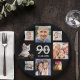 Um prato de papel para uma festa de aniversário de 90 para uma jovem celebrando sua vida com uma colagem de 8 fotos suas. Modelo a idade de 90 anos e uma data. Data de nascimento ou data da festa. Letras brancas e cinzas coloridas. Fundo preto.