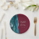 These elegant modern wedding plates feature a teal watercolor design trimmed with faux silver glitter. Easily customize the silver gray text on a burgundy red background, with the names of the bride and groom in handwriting calligraphy over a large ampersand.