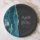 These elegant modern wedding plates feature a teal watercolor design trimmed with faux silver glitter. Easily customize the silver gray text on a dark off-black background, with the names of the bride and groom in handwriting calligraphy over a large ampersand.
