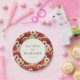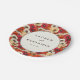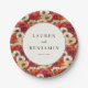 Este prato de casamento apresenta um vibrante padrão floral com papoulas densamente compactadas em tons de vermelho profundo, rosa suave, branco cremoso e centros amarelos, criando um pano de fundo animado e colorido. O design inclui um círculo branco central bordeado por uma linha preta fina, onde uma tipografia elegante exibe os nomes e a data em fontes serifadas e não serifadas contrastantes. O estilo de representação semi-realista captura detalhes essenciais, ao mesmo tempo em que mantém uma aparência estilizada, transmitindo um clima alegre e festivo perfeito para celebrar ocasiões especiais como casamentos.