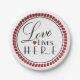 Este design de texto que flui está rodeado por uma borda vermelha de corda e arrancado com um pequeno coração vermelho. Também está disponível com uma borda preta ou branca. Os guardanapos da festa estão disponíveis neste motivo.