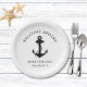 Placas modernas de papel para o seu barco que apresentam uma ilustração de uma âncora preta, e "Bem-vindo a Bordo" e o nome e a localização do seu barco em tipografia e roteiro elegantes.