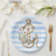 âncora náutica prateada e buquê de margarida branca sobre fundo de faixa de cor d'água