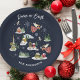 Uma ilustração animada de Natal com arte popular, apresentando um anjo de Natal de paz na terra com uma pomba branca. Ela voa acima de uma vila de montanha de inverno com casas coloridas, árvores de Natal e animais correndo na neve, flocos de neve deslizam para baixo. Perfeito para decorar sua mesa de Natal para seus entes queridos neste Natal. Arte original pintada à mão por Caroline Bonne Müller