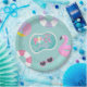 Festa de piscina para garota com flutuadores roxos e cor-de-rosa