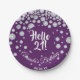 Um prato de papel elegante e glamouroso para uma festa de aniversário de 21 anos para uma garota. Um fundo colorido púrpura chico. Um círculo cor roxa com texto moderno escrito à mão: Olá 21! Diamantes falsos como decoração. Modelo de nome e data.