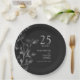 Elegantes e sofisticados pratos de papel para aniversário de casamento de 25 anos com motivos botânicos florais prateados e pretos podem ser personalizados com as informações da sua celebração em tipografia prateada moderna. Concebido por Thisisnotme©