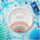 Um prato de papel de festa de aniversário bonito para um aniversário de criança. Este design apresenta um arco-íris de aquarela moderno em cores pastéis - rosa pincelado, azul claro, terracota e chalé. As cores do texto correspondem ao arco-íris. Personalize estas placas de papel para o aniversário com o nome do aniversariante.