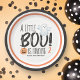 O tema do Dia das Bruxas, em pratos de aniversário para as celebrações de outubro, apresenta "A Little Boo Is Turning...." tipografia com um fantasma de aquarela fofo e sotaque de lanterna e escrita à mão. As cinzas e as cores laranja são perfeitas para uma menina ou um menino. Arte da KL Stock.
