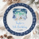 Esta gira e branca placa de aniversário de aquarela apresenta uma cena maravilhosa de inverno com cor d'água com adoráveis animais árticos, como um urso polar, pinguim, gato, coruja, foca e um alce. Ao fundo estão as luzes do norte, montanhas e árvores com capa de neve. O texto combina o script manuscrito e as fontes sans serif para uma aparência na moda e moderna. Flocos de neve a cair e belos arranjos florais azuis dão uma sensação de inverno. Isto é perfeito para chás de fraldas de inverno e Natal.
