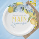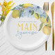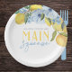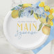 Elegantes e Doces Limão Branco Ela Encontrou Seu Main Squeeze Pratos de Papel Personalizados. Personalize com o nome da noiva. Apresentando belas flores de aquarela em azul ardósia elegante e limões amarelos doces.