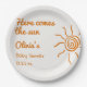 Prato De Papel Aqui Vem O Chá de fraldas Desenhado Da Mão Do Filh