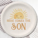 Você está planejando o chá de fraldas de um menino? Esta placa de papel de chá de fraldas, com formato solar, é decorada com um sol sorridente e uma tipografia de na moda de cor aquosa em fundo de creme macio. Original Watercolor © Michele Davies.