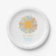 Chapas de papel personalizadas. Projetado com um Sol retroativo em amarelo alaranjado com raios solares azuis claros. Procure nosso tema de sol boêmico para correspondência de artigos de papelaria e de festa. Napkins, convites, obrigado cartões, chá de fraldas.games e muito mais
