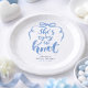 Adicione um toque charmoso e divertido ao seu chá de noiva “Ela Está Casando” com esses pratos de papel de arco de fita azul suave caprichados.