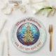 Design de vidro brilhante e vibrante manchado de uma árvore de Natal multicolorido num quadro vermelho. Com um fundo verde claro e brilhante e "Feliz Natal" (personalizável). Você pode mudar o texto na parte inferior do design para sua própria mensagem.