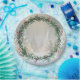 Árvores de Natal embelezadas com neve branca e uma coroa festiva vermelha e verde circular.
