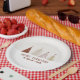 O design de prato de festa de papel festivo sazonal apresenta uma exibição sofisticada de árvores de Natal nevadas em vermelho, dourado e rosa em um fundo bege creme neutro levemente listrado e coberto de neve. A seção inferior é coberta de neve branca com "Feliz Natal" em tipografia clássica elegante. Adicione um nome personalizado ou linha de texto personalizado em letra cursiva vermelha correspondente com o modelo fácil de usar. Por favor, envie mensagem ou e-mail para beachpausedesigns@gmail.com para personalizações adicionais.