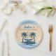 Lindo pratos de festas de aposentadoria. Design constituído por uma praia de areia costeira com cor aquática e fundo marinho azul com palmeiras e aves. A decoração perfeita para uma festa surpresa de aposentadoria. Todo texto pode ser personalizado e, em seguida, personalizar com um nome, evento e data. Seria também excelente para aniversários de aniversário, aniversários de casamento e muitas outras celebrações.