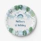 Estas lindas placas de papel de aniversário apresentam dinossauros azuis com folhas de aquarela tropical.